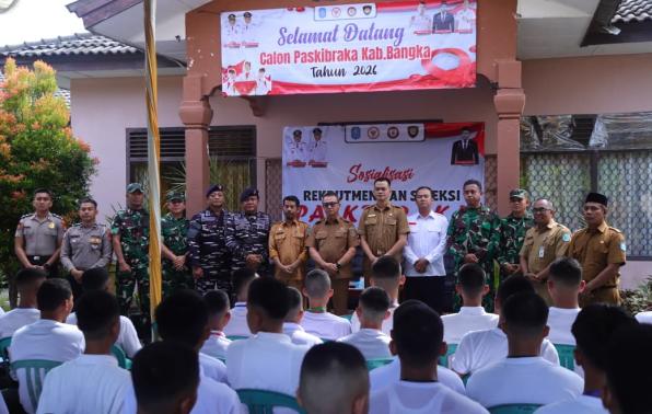 Sungailiat - Pemerintah Kabupaten Bangka menggelar rekrutmen dan seleksi Pasukan Pengibar Bendera Pusaka (Paskibraka) Tahun 2026 di halaman Kantor Bankesbangpol Kabupaten Bangka, Senin (06/04/2026). Kegiatan tersebut dibuka langsung oleh Wakil Bupati Bangka Syahbudin S.IP M.Tr.Ip serta dihadiri para pelatih dan petugas seleksi dari anggota TNI, Polri dan PPI (Purna Paskibraka Indonesia) dan para calon peserta seleksi Paskibraka dari perwakilan siswa SMK/SMA se Kabupaten Bangka. Dalam sambutanya Wakil Bupati Bangka, Syahbudin mengharapkan agar rekrutmen dan seleksi ini bisa mendapatkan calon anggota Paskibraka Kabupaten Bangka yang akan menjalankan tugas yang berat dan mulia dalam upacara HUT Kemerdekaan RI tanggal 17 Agustus 2026 mendatang dengan baik dan bertanggungjawab. "Saya harapkan untuk calon Paskibraka ini harus memiliki sikap yang tanggung jawab, disiplin, rela berkorban dan berdedikasi tinggi serta memiliki akhlak dan kepribadian yang baik,” harapnya Perlu di ketahui, jumlah peserta seleksi Paskibraka 2026 sebanyak 169 peserta dan yang berhasil lulus seleksi administrasi sebanyak 137 peserta.
