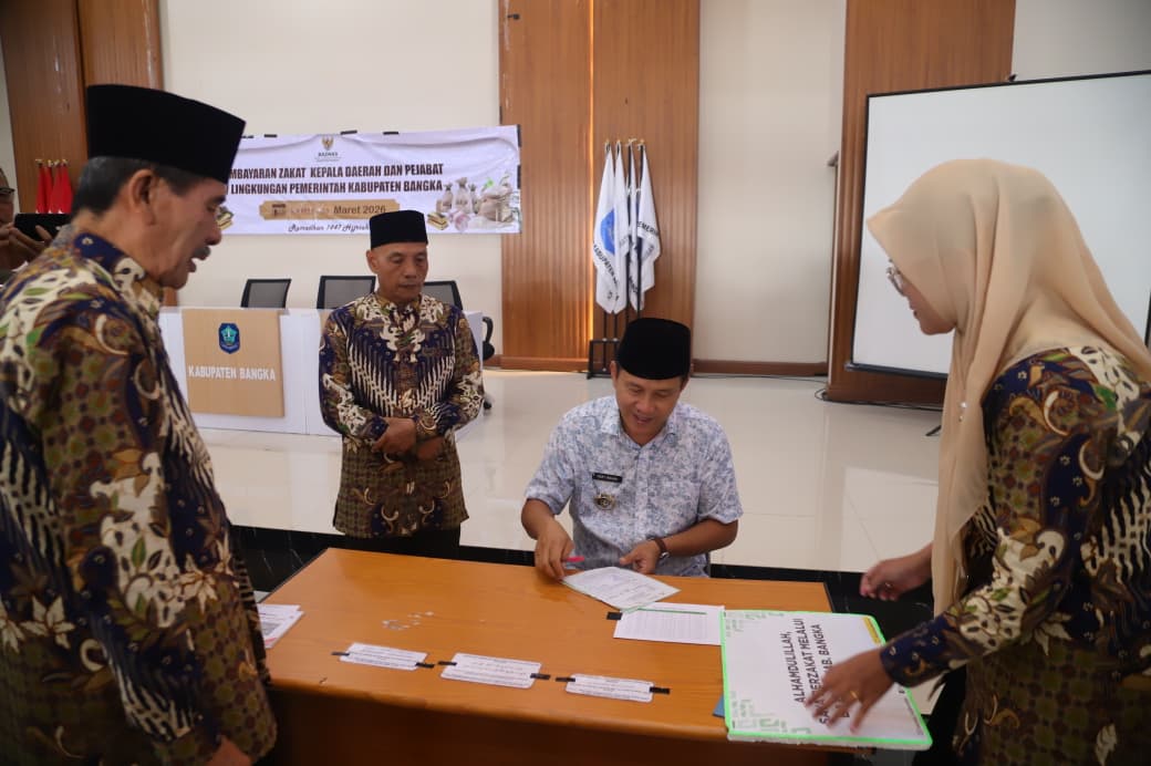 Sungailiat – Bupati Bangka Fery Insani melakukan pembayaran zakat Mal (harta) yang di bayar langsung kepada Baznas Kabupaten Bangka yang disaksikan oleh ketua Baznas Kabupaten Bangka bertempat di Gedung GRHA Maras, Kamis (5/3/2026).