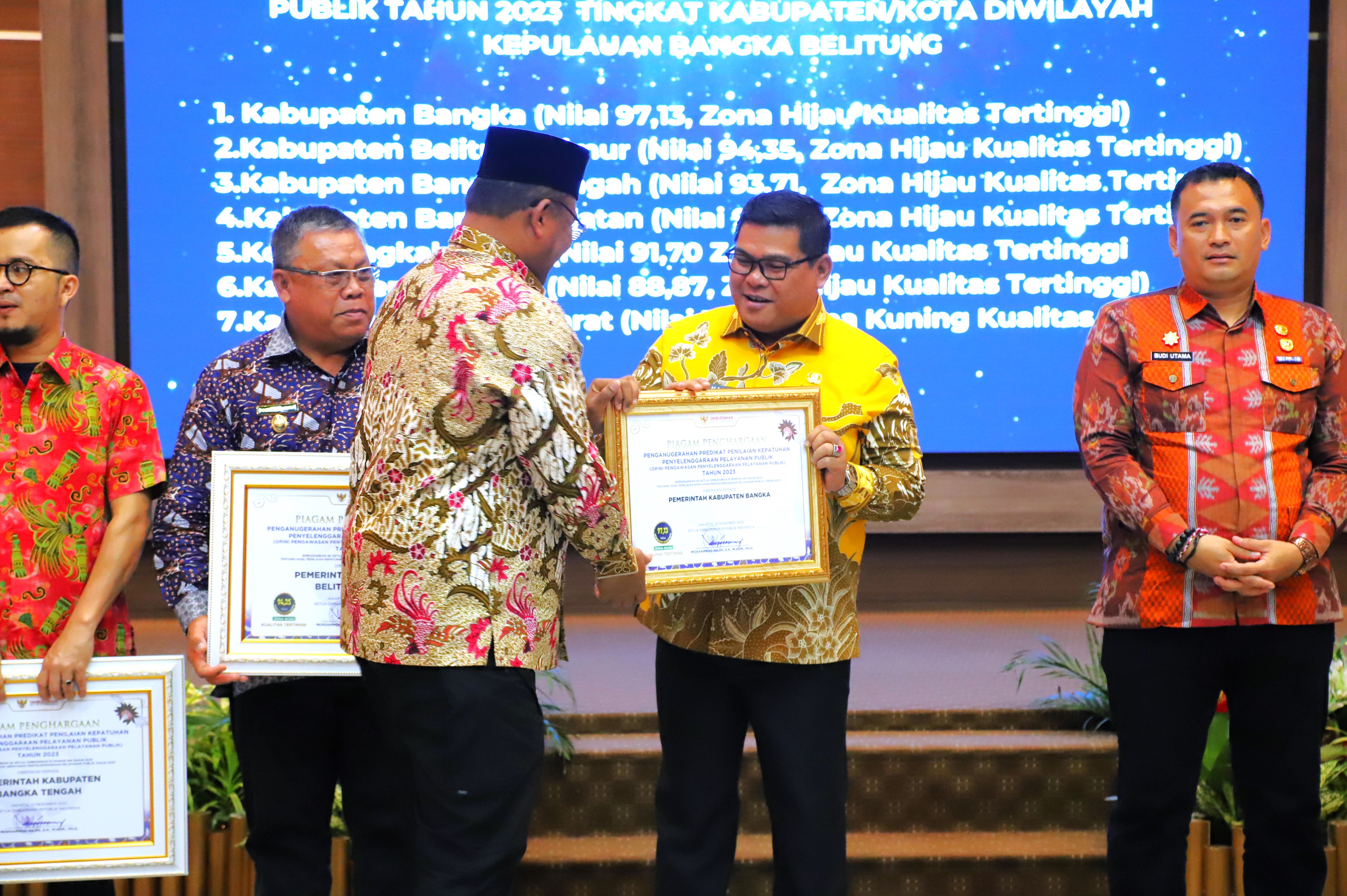 Pangkalpinang – Pemerintah Kabupaten Bangka menerima Penganugrahan dari Ombudsman RI Perwakilan Provinsi Kep. Babel dalam Predikat Penilaian Kepatuhan Penyelenggaraan Pelayanan Publik Terbaik Pertama ditingkat Kabupaten/Kota se-provinsi Kep. Bangka Belitung untuk tahun 2023.