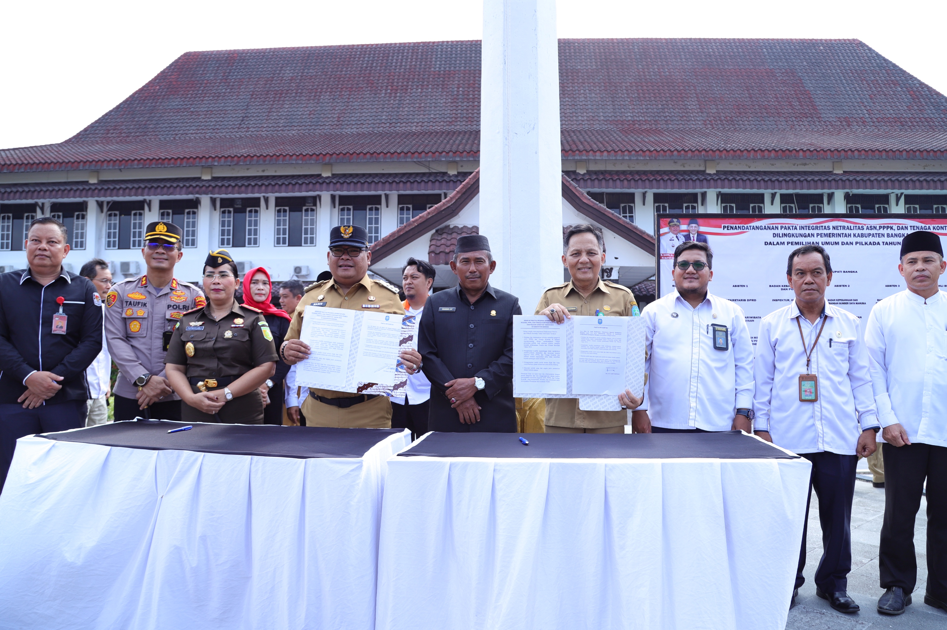 Di akhir apel bersama, Penjabat Bupati Bangka M. Haris, Sekda Bangka Drs. H. Andi Hudirmanserta seluruh kepala OPD melakukan penandatangan Pakta integritas Netralitas ASN dalam menghadapi pemilu 2024 serta mengucapkan ikrar netralitas ASN bersalam seluruh jajaran pegawai di lingkungan Pemkab Bangka.